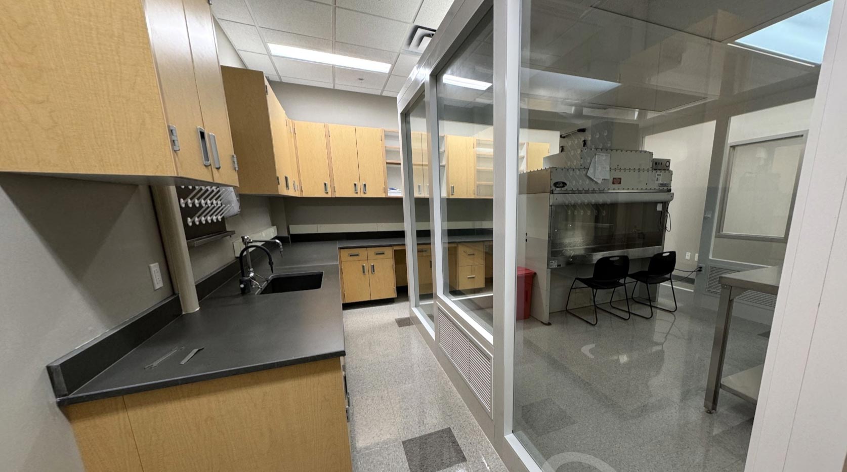 - Lab includes a large bench-top with sink, chairs, and bio-safety cabinet